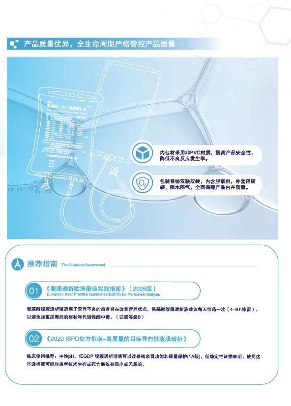 【適 應(yīng) 癥】本品為不含葡萄糖的腹膜透析液,作為腹膜透析方案的一部分用于治療慢性腎衰患者,特別適用于血清蛋白低于35g/L的腹膜透析患者