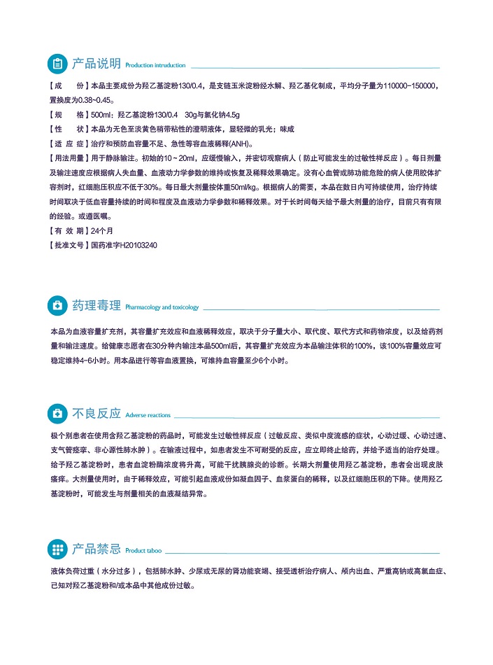 【成 份】本品主要成份為羥乙基淀粉130/0.4,是支鏈玉米淀粉經(jīng)水解、羥乙基化制成,平均分子量為110000-150000,置換度為0.38~0.45。